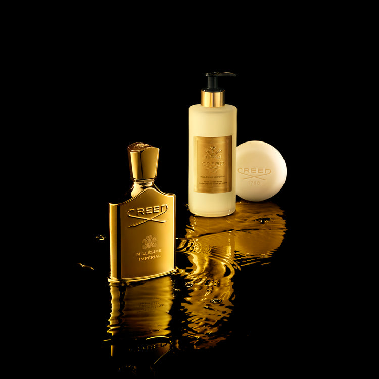 Disfruta de un momento de cuidado personal con el Jabón Perfumado Millésime Impérial: limpia suavemente e infusionado con una de las fragancias más célebres de Creed.